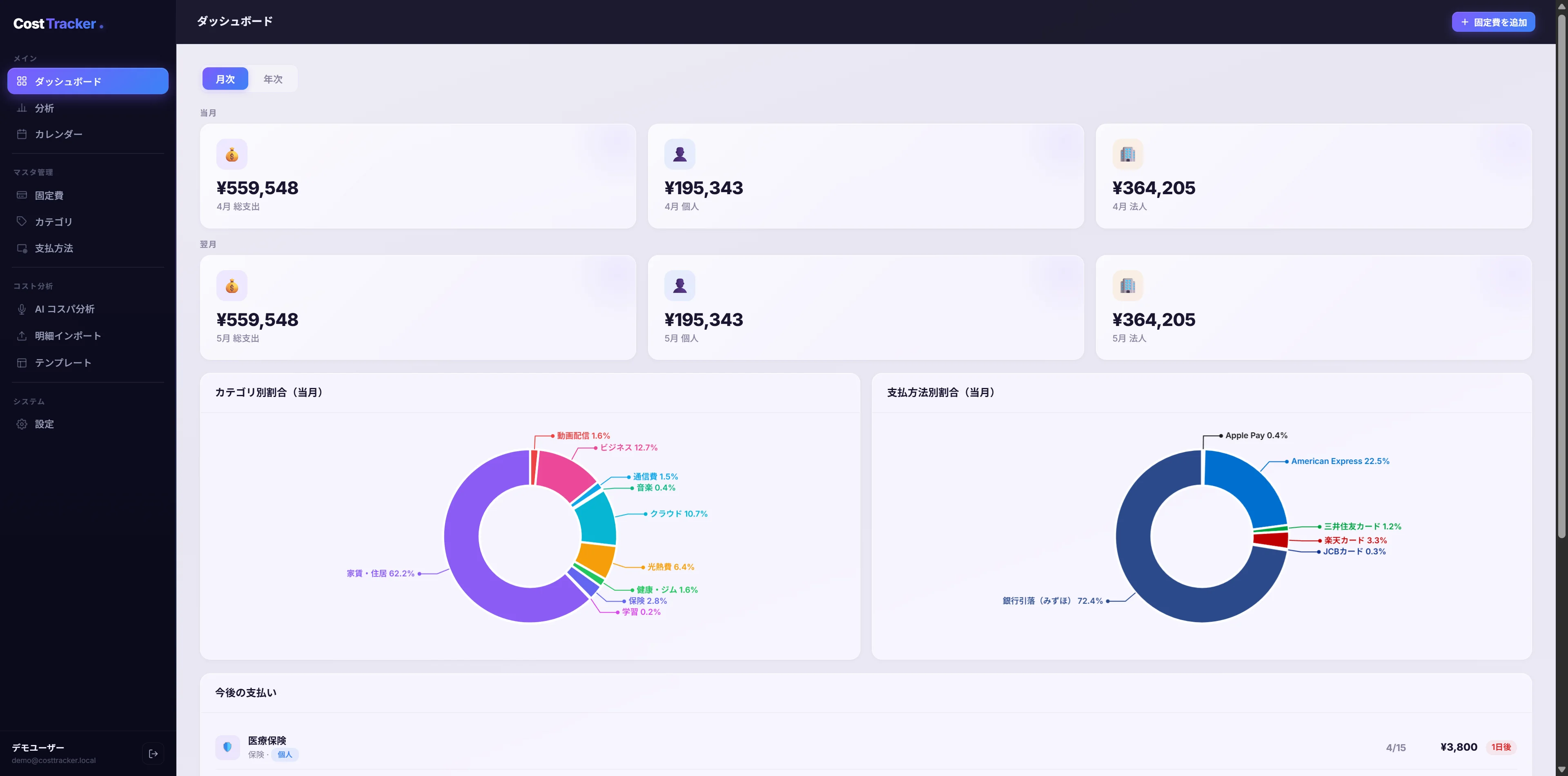 家計簿でも会計ソフトでもない、固定費に特化した SaaS 管理ツール。サブスク・家賃・保険・光熱費・クラウド費用など、複雑な月額固定費を個人と法人に分けて一元管理します。銀行・クレジットカード明細の自動取込、AI 搭載のコスパ分析エンジン、使用回数トラッキング機能により、見落としがちな無駄な契約を自動検出し、解約候補を提案します。